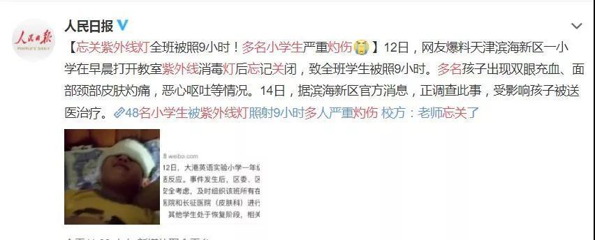 天津小学忘关紫外线消毒灯,多名小学生出事!