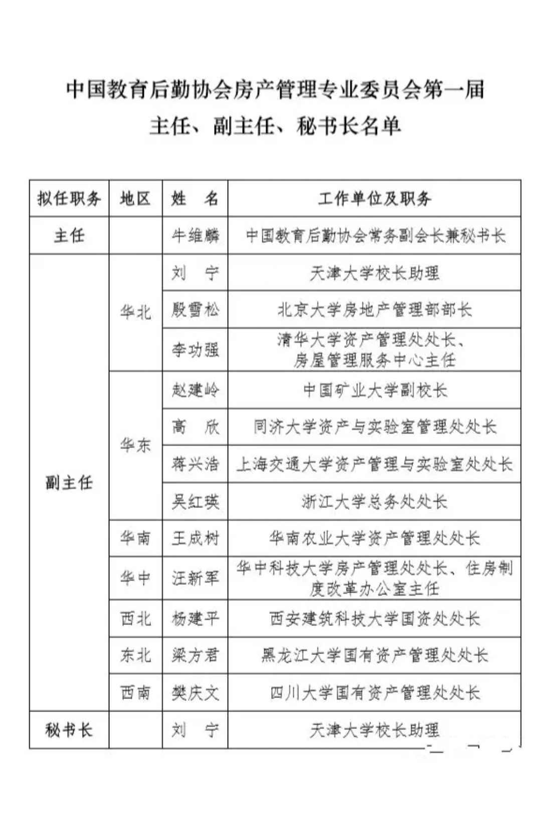 中国教育后勤协会房产管理专业委员会第一届全体委员大会的全体委员代表听取了“关于中国教育后勤协会房产管理专业委员会筹备工作报告”、审议通过了《中国教育后勤协会房产管理专业委员会组织规则(草案)》;选举产生了第一届房专会常委会常委77名。大会一致选举通过中国教育后勤协会常务副会长兼秘书长、中国人民大学原党委常务副书记、副校长牛维麟任主任;选举通过天津大学校长助理刘宁、北京大学房产管理部部长殷雪松、清华大学房产管理处处长李功强等十二位同志任副主任;选举通过刘宁任秘书长。房专会一届一次常委会根据秘书长提名审议通过了27位副秘书长的聘任;讨论通过了房专会发展战略和工作规划。