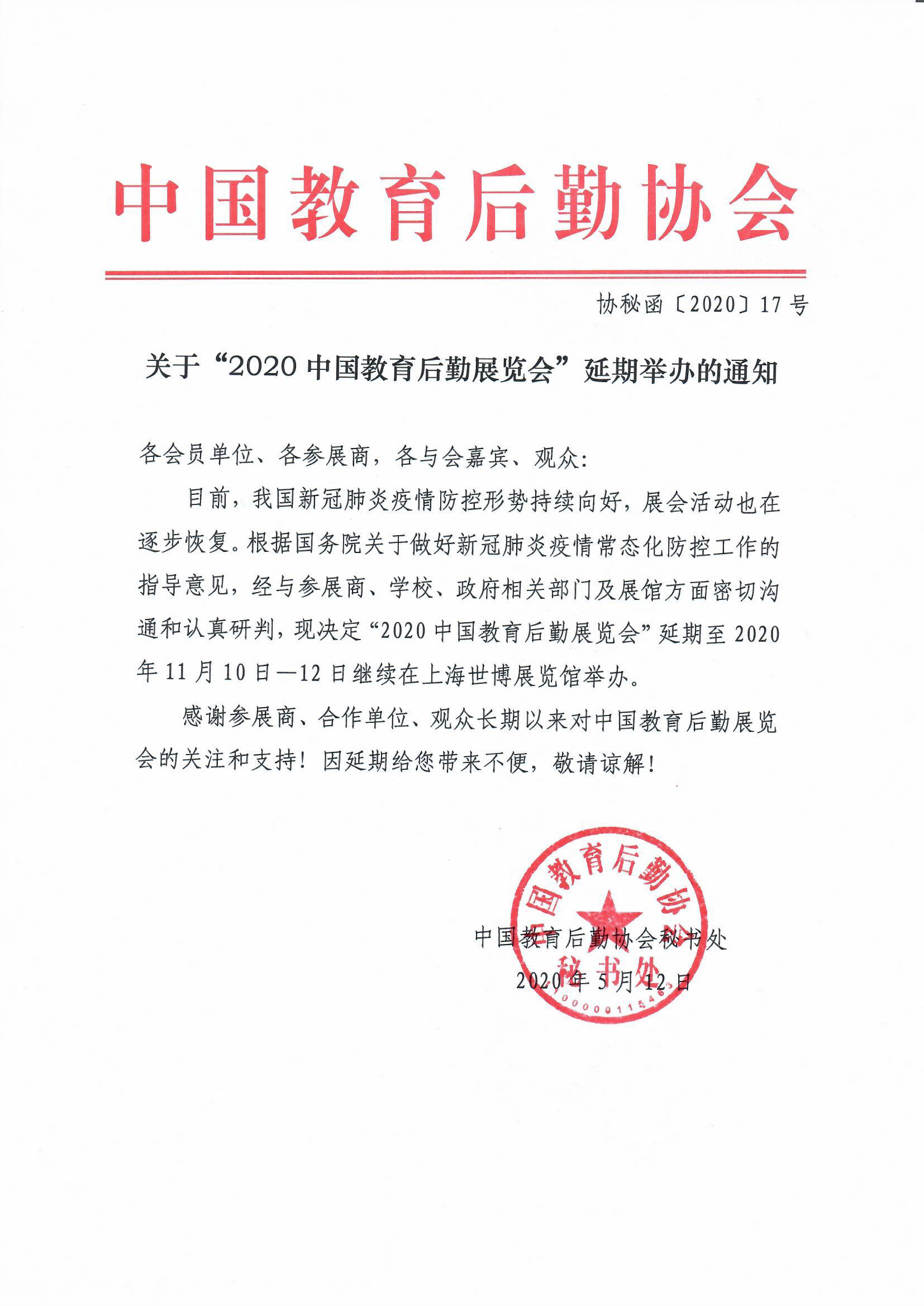 目前,我国新冠肺炎疫情防控形势持续向好,展会活动也在逐步恢复。根据国务院关于做好新冠肺炎疫情常态化防控工作的指导意见,经与参展商、学校、政府相关部门及展馆方面密切沟通和认真研判,现决定“2020中国金年会览会”延期至2020年11月10日—12日继续在上海世博展览馆举办。