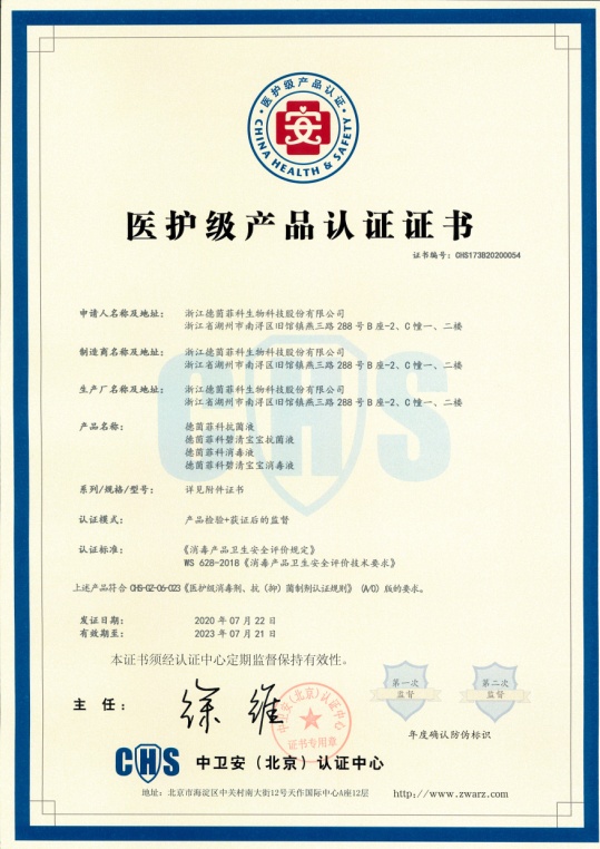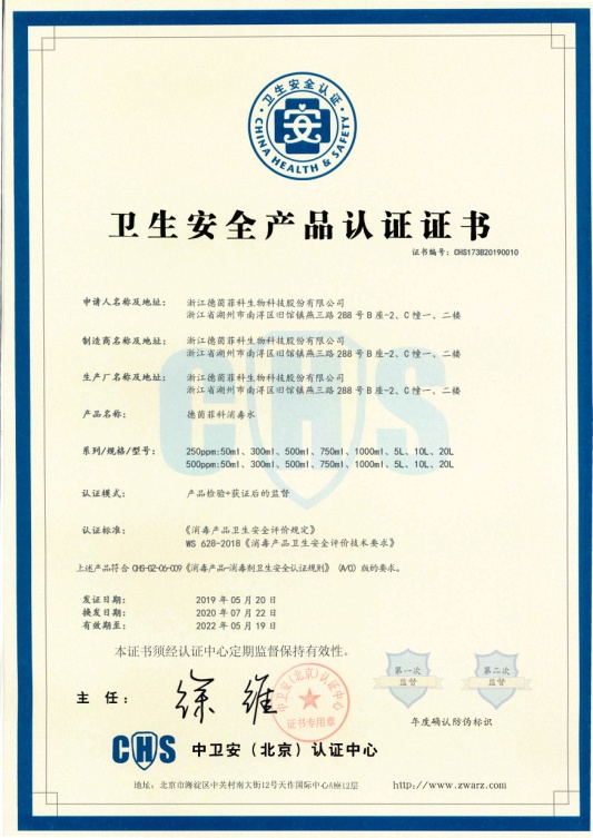 2020年取得了国家级权威机构中卫安(北京)认证中心的卫生安全产品认证、医护级产品认证,是市场上获得双认证的次氯酸消毒产品。