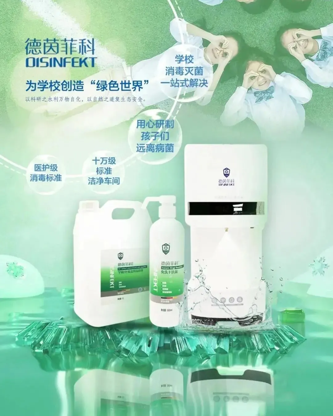 背负式电动喷雾器中雾化喷出的消毒液正是徳茵菲科消毒液,其安全环保的特性非常适用于幼儿园消毒,不燃、无害、可接触,更可靠地守护小朋友的健康与安全。”