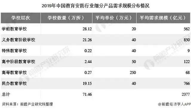 根据相关部门通报,2021年全国仍有10%中小学一键式报警和视频监控系统安装不到位。依据相关招投标统计,各阶段学校(幼儿园、中小学、大学)以及每所学校经济条件、规模等情况的不同,安防项目资金的投入不尽相同。一般来说,幼儿园安防项目所需投入金额范围平均单价为20万,中小学是40万,高中阶段约50万,普通高校250万,部分高校甚至上千万。据此推测目前国内中小学安防市场仍存在近百亿存量市场。