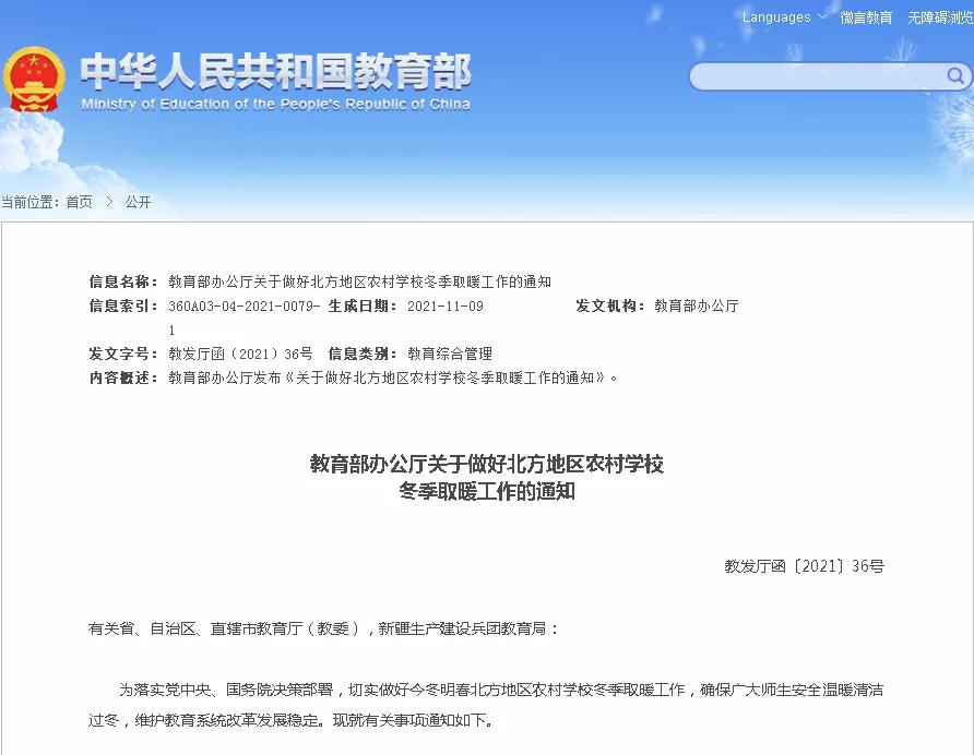 教育部近日印发通知,要求切实做好今冬明春北方地区农村学校冬季取暖工作,确保广大师生安全温暖清洁过冬,维护教育系统改革发展稳定。