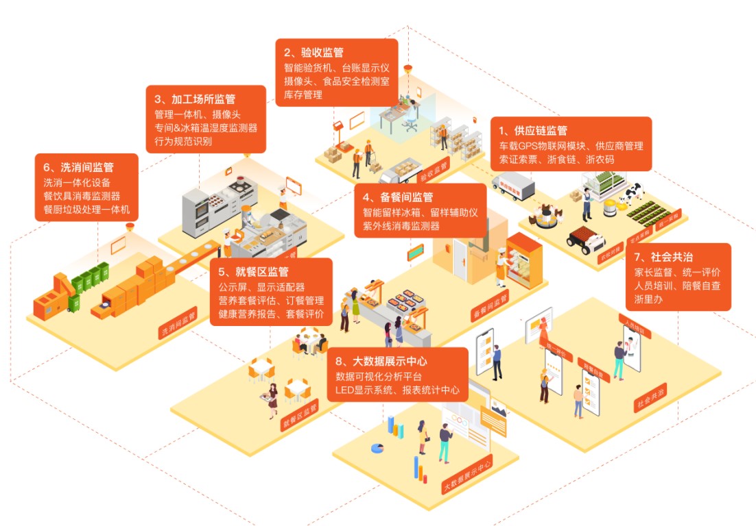 数字化食品安全的全场景应用,从供应链到食材验收,通过云端平台实现线上采购和配送管理,利用智能验货机来确保食材品质和票证合格;