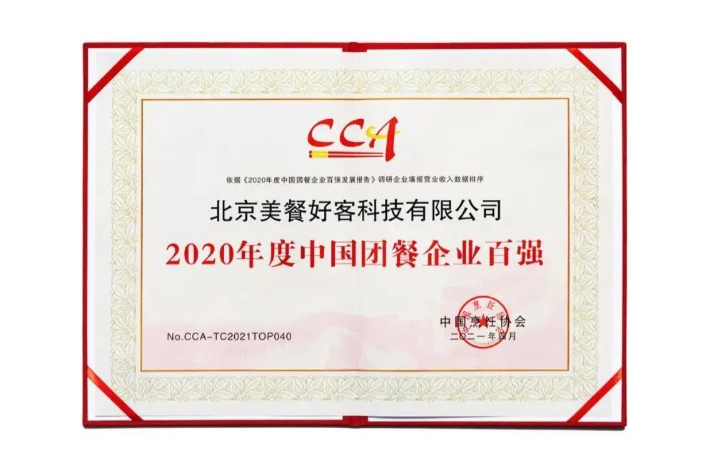 2021 年,美餐荣获 2020 年度中国团餐百强企业。