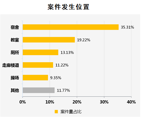 根据中国司法大数据研究院发布的《校园暴力 司法大数据专题报告》显示,校园欺凌案件中,有55.12%是因为发生争吵而引发;案件发生的场所中,宿舍区域占比高达35.31%、厕所区域占比13.13%、走廊楼道区域占比11.22%,这些区域的共同点是没有监控覆盖。