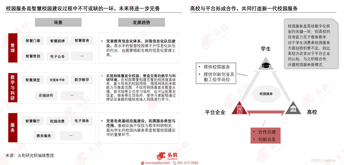 校园服务场景是智慧校园建设场景中的重要一环。现如今,不仅高校积极与第三方平台企业合作共同打造新一代校园服务外,各地政府也积极倡导学校注重引入社会资源,如北京市即提出“支持学校通过复用市、区级共性应用或购买社会服务的方式,降低信息化投入成本,避免重复建设。探索多元投入机制,引导社会企业参与教育信息化建设,实现共赢,激发市场活力。”