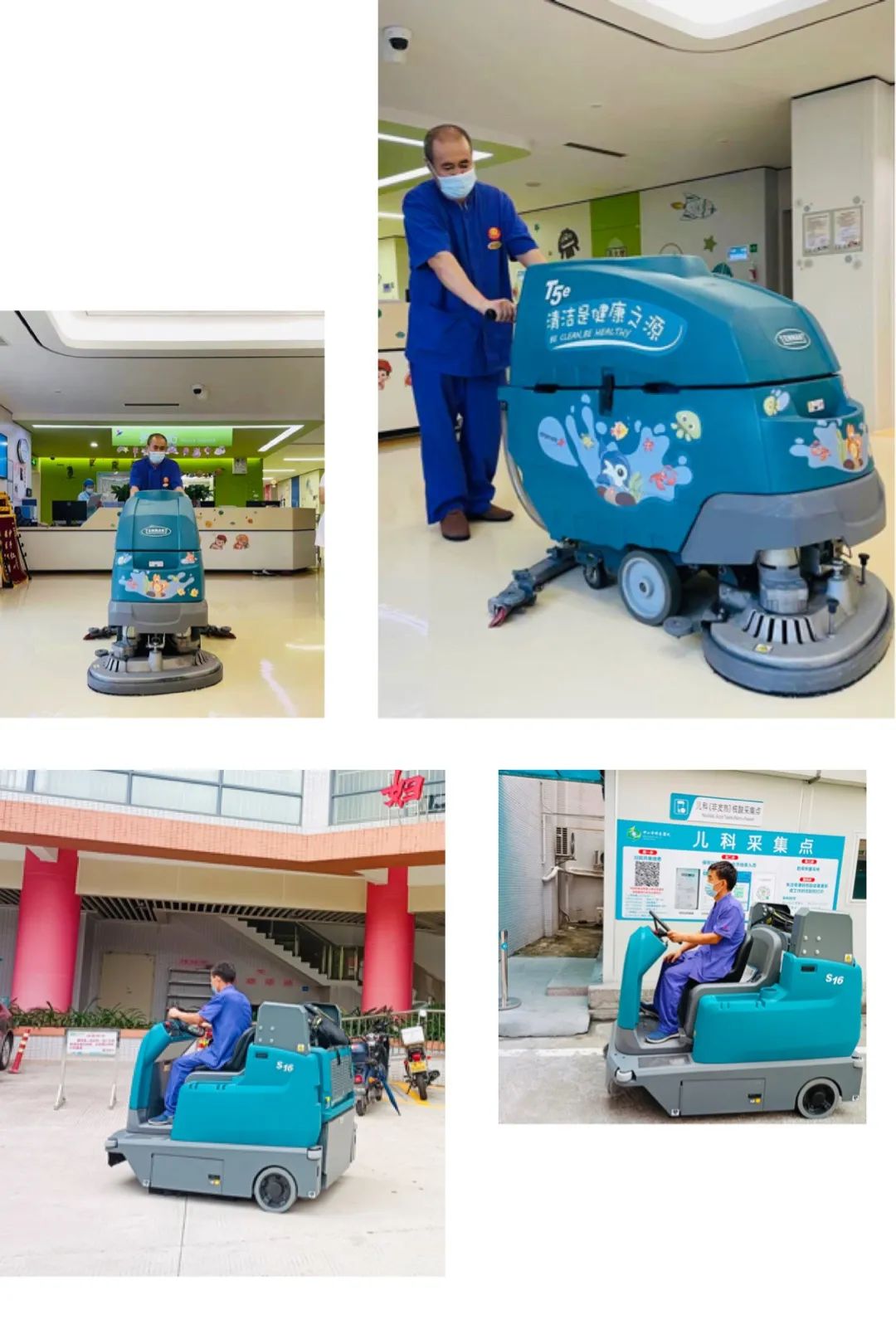 坦能联合爱玛客为户外/室内大型体育场、礼堂、教学楼大厅、停车场等地面提供中型驾驶式洗地机。