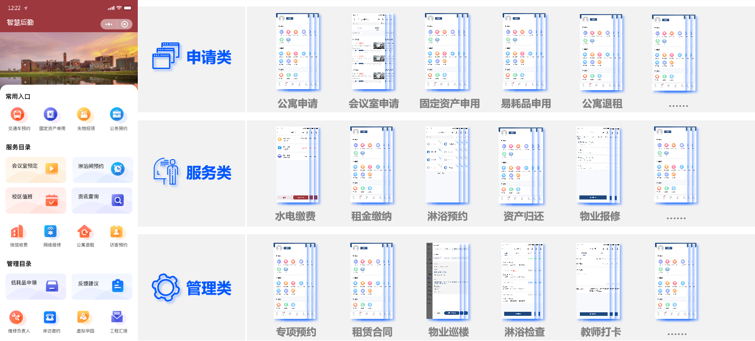 对公寓、淋浴间、会议室、功能房、场馆等空间进行数字化赋能与信息化管理,为师生用户提供更便捷的预约通道和更优质的使用体验。
