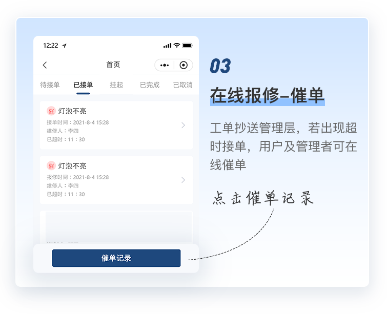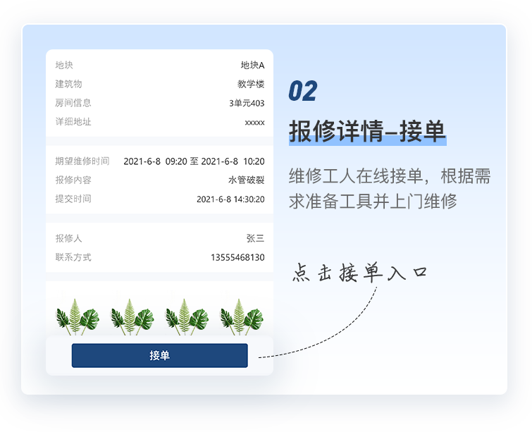 学校报修摆脱粗放式管理,对工作人员的响应速度、维修频次、服务质量等进行全方位自动化在线跟踪,工作成果可视化,实现精细化团队管理,有效控制成本,提升用户满意度。
