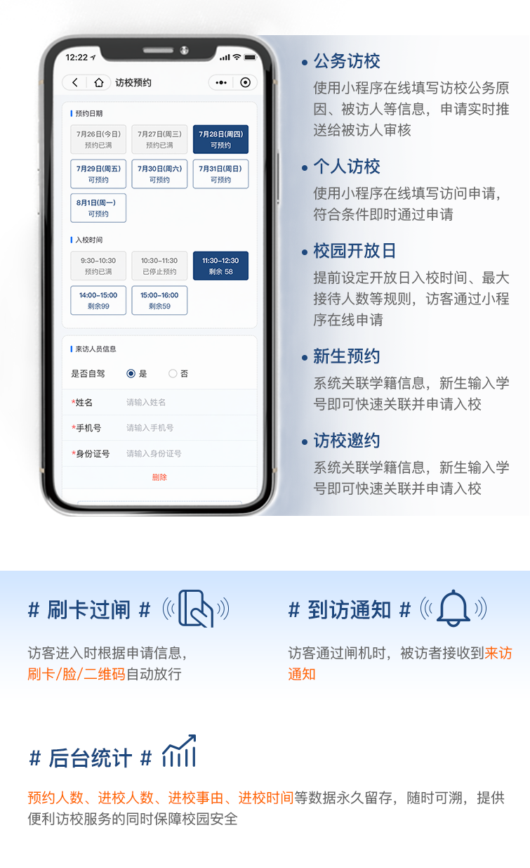 访校预约、审核、放行一站式线上完成,大幅减少申请流程及预约耗时,预约记录和访客数据随时可溯,保障校园安全。