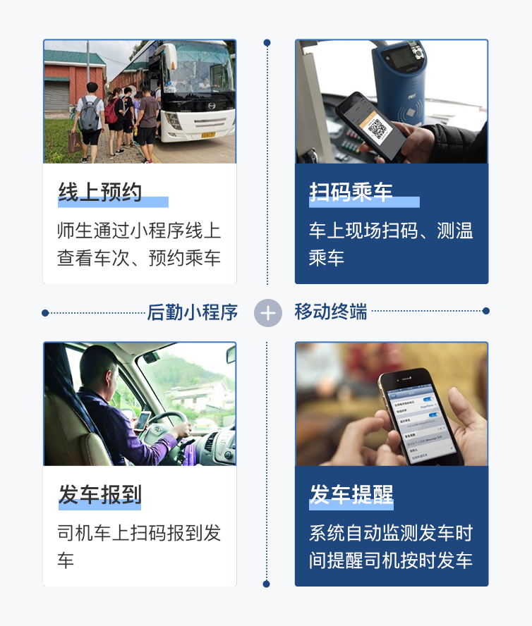 想坐校车出行不用再担心发车时间不定、耽误行程,小程序快速查询班次、预约乘车,支持一次多人或一人多次预约,后台自动向司机推送发车提醒、监督司机发车,准点有保障!