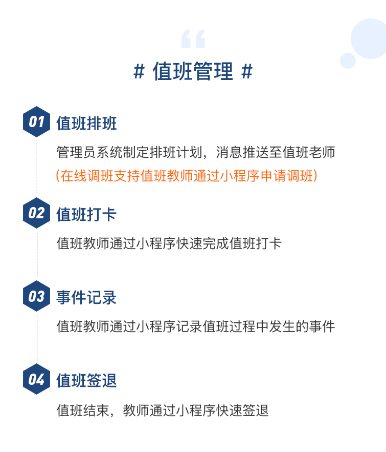 线上便捷完成排班、调班、值班、打卡等办公事项,提高管理效率,带来智能办公便捷新体验。