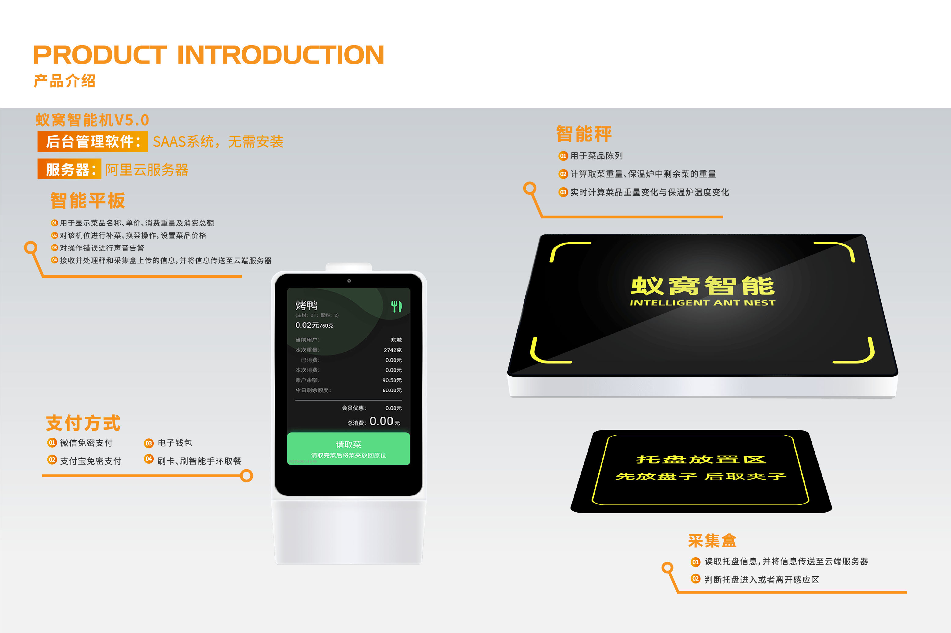 智能一体化取餐结算设备,将RFID技术与高精度称重技术的完美集成。不怕“食堂阿姨”手抖,全程自助自选。告别排队,无需收银台,取餐结束,自动结算。重量感应精确到1克,多吃少吃自己把控。真正实现公开透明,迅速高效,灵活自主的用餐体验。