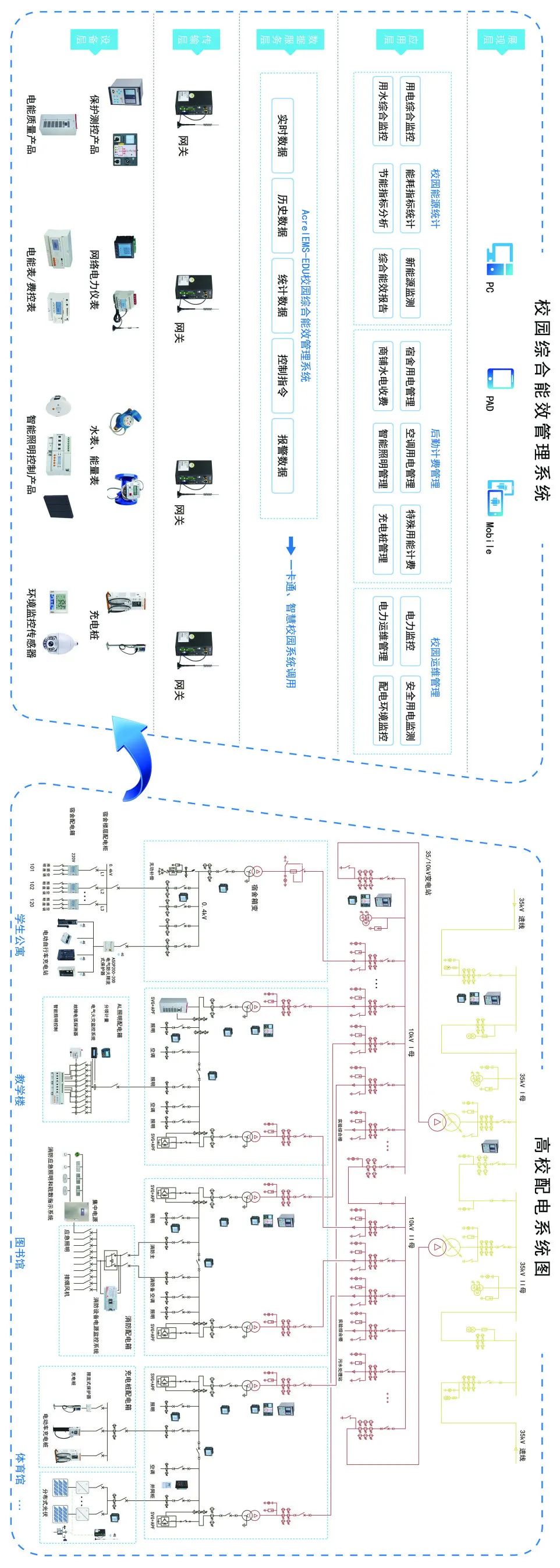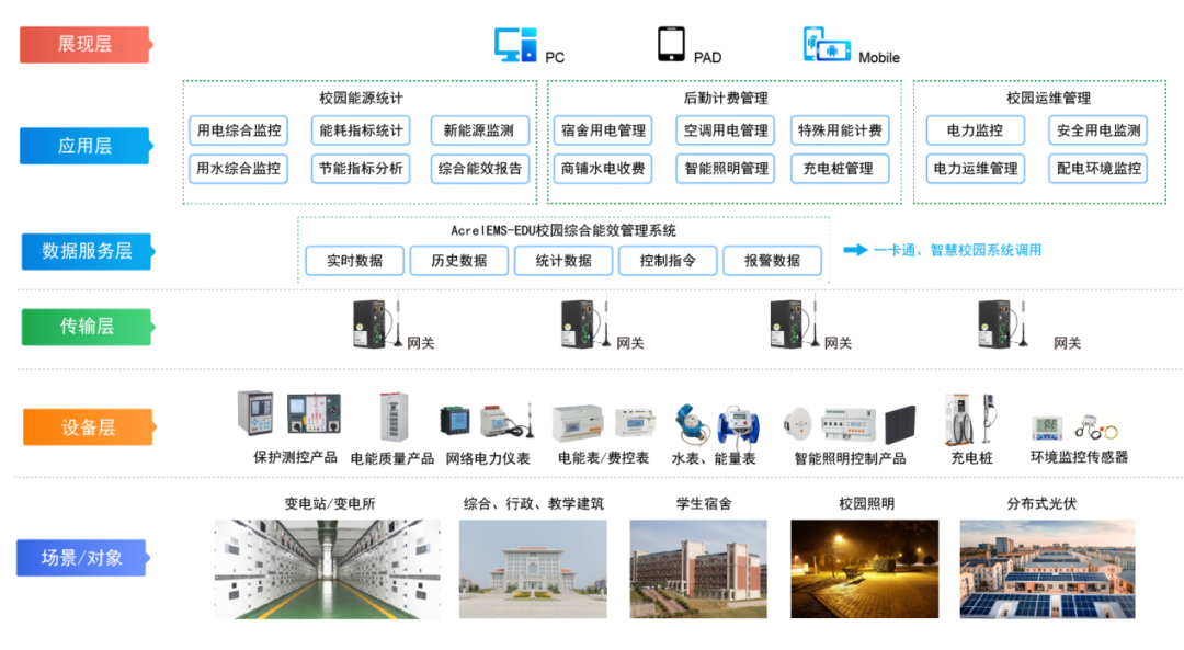 AcrelEMS-EDU绿色校园能效管理平台针对校园能源统计、后勤计费管理、校园运维管理等提供高效的信息化管理和服务,从“源、网、荷、储、充”多个角度解析高校当下及未来的用能问题及用能需求,实现“能源互补、信息互通”,助力学校管理智能化、数字化、综合化,实现节能校园、绿色校园、低碳校园。