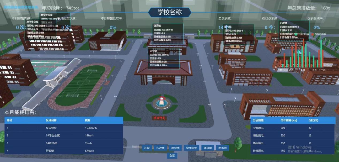按校园建筑的分类进行能耗统计分析:如办公类建筑耗电、教学类建筑耗电、学生宿舍耗电等,对数据分门别类地分析,提供领导决策,提高管理效能。构建符合校园节能监管内容及要求的数据库,能自动完成能耗数据的采集工作,自动生成各种形式的报表、图表以及系统性的能耗审计报告,能够监测能耗设备的运行状态,设置控制策略,达到节能目的。