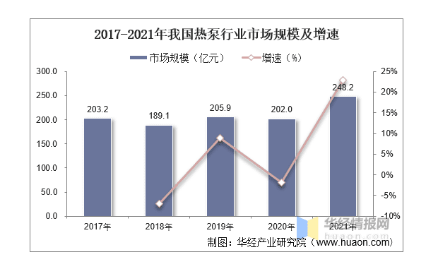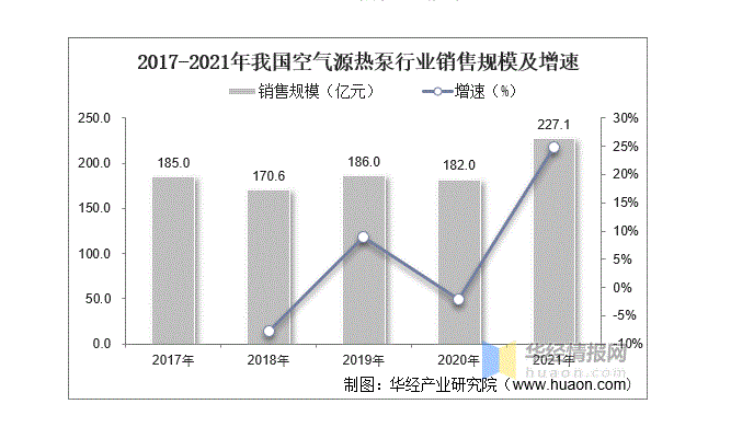 ▲2017-2021年中国空气源热泵行业销售规模及增速