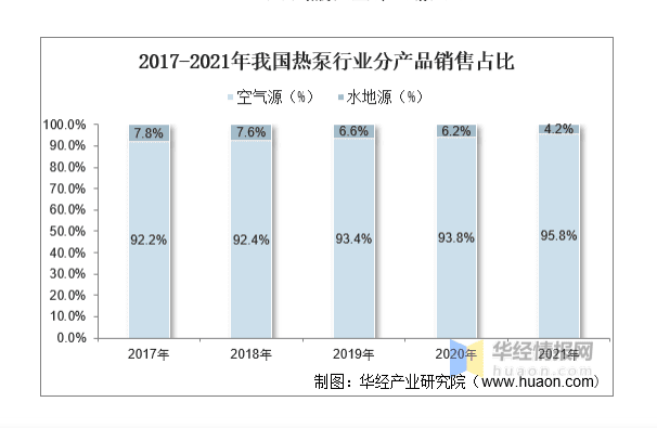 从中国热泵行业产品销售占比走势来看,可以明显看到水地源热泵销售占比呈下降趋势,而空气源热泵销售占比较为稳定,整个热泵行业的发展由空气源热泵产品作为主要产品带动市场发展。
