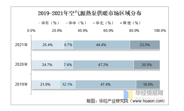 从中国空气源热泵供暖区域市场表现来看,2021年华北、华东依然是拉动区域市场发展的主流应用市场,但是从增长趋势来看,南方市场不断扩容,区域市场布局逐渐均衡。除此之外,东北、西北地区由于燃煤政策的限制以及煤炭价格的上涨,加速了农村市场采暖形式的替换,空气源热泵的规模增长显著。