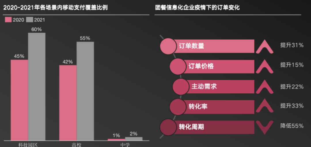 自疫情以来,团餐信息化企业订单数量、订单金额同比上升了31%,主动需求提升22%,订单转化率提升33%,转化周期也缩短了55%。
