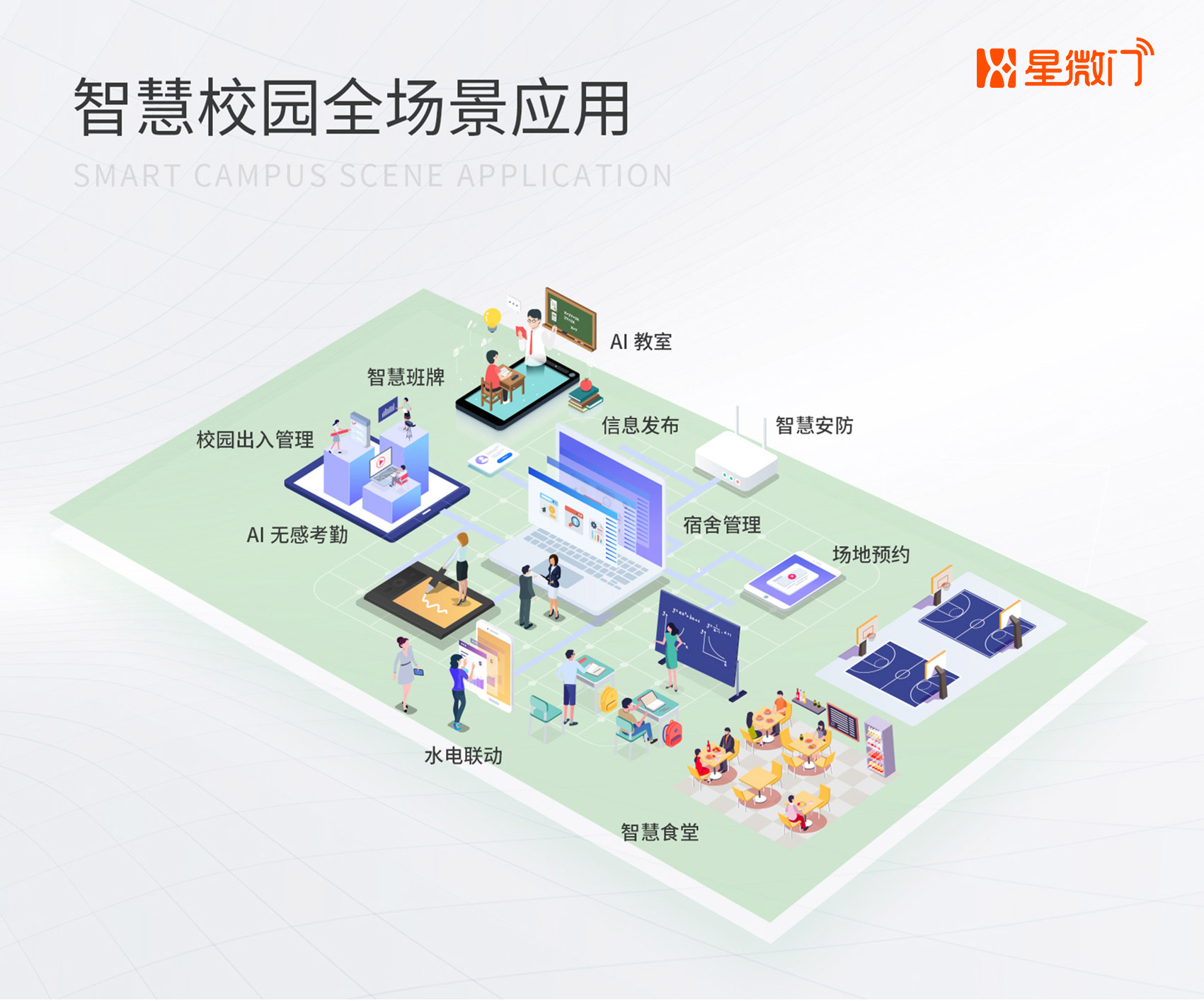 在国家教育数字化和校园新基建政策指导下,星微门以AI技术驱动“数字校园”向“智慧校园”转型,提供校园出入管理、无感考勤、AI教室、智慧班牌、信息发布、场地预约、智慧食堂、宿舍管理、水电联控、智慧安防等应用。