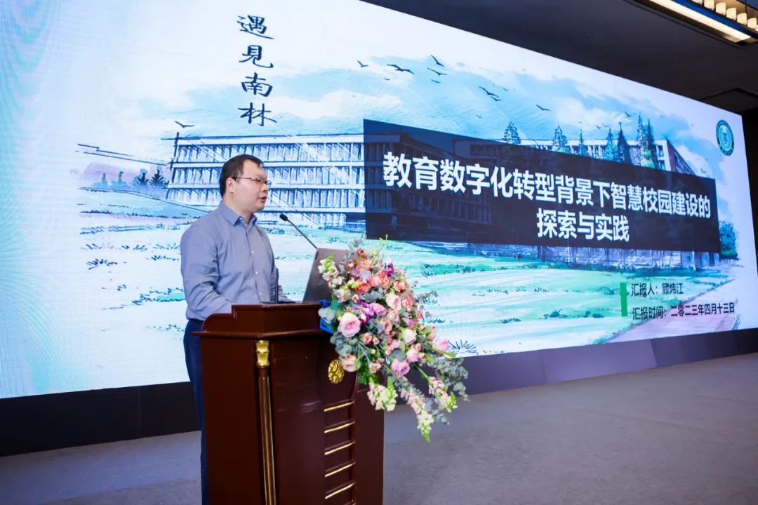 南京林业大学网络安全和信息化办公室主任顾炜江以《教育数字化时代智慧校园建设探索与实践》为题进行分享,讲解了南京林业大学智慧校园建设背景、实施方案、工作开展及成效,介绍了未来在新校区信息化建设方面的布局规划。