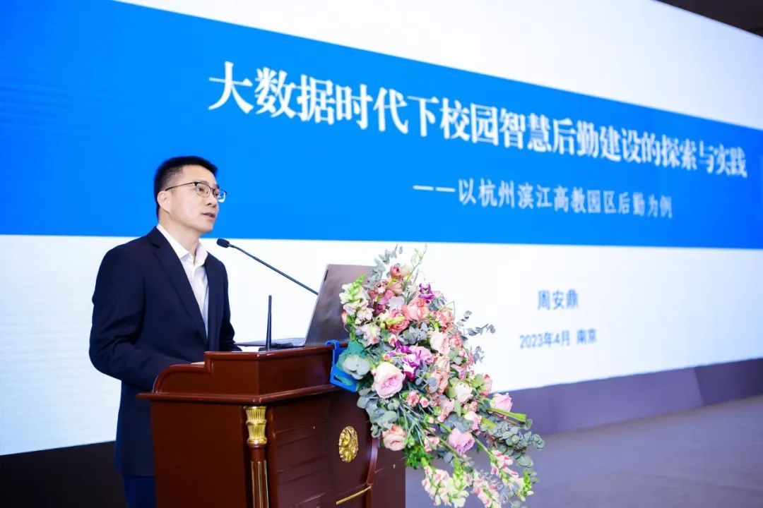 浙江浙教集团有限公司总经理周安鼎作《大数据时代下校园智慧后勤建设探索与实践》主题分享,以杭州滨江高教园区后勤为例,介绍了园区后勤服务的特殊性、信息化建设探索实践及经验体会。