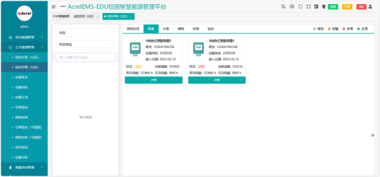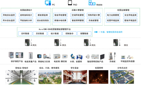 AcrelEMS-EDU校园智慧能源管理平台针对综合能源管理、公共能源管理(定额管理)、智慧用水管理、宿舍用电管理、课表管理、安全运维管理及网上报修等提供高效的信息化管理和服务,从“源、网、荷、储、充”多个角度解析高校当下及未来的用能问题及用能需求,实现“能源互补、信息互通”,助力学校管理智能化、数字化、综合化,实现节能校园、绿色校园、低碳校园。