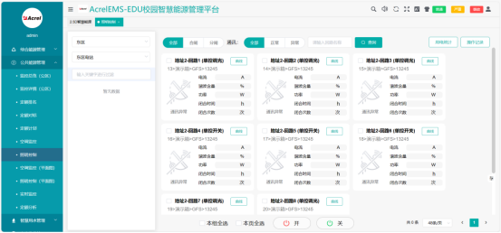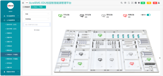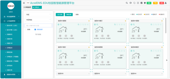 空调监控:系统可通过场景组态图直观展示空调分布及空调状态,可进行楼栋、楼层切换,批量设置空调开关。