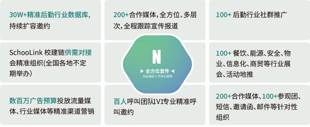 由中国教育后勤协会、地方后勤协会及各分支机构发布红头文件通知,组织全国各级各类院校领导、总务、后勤、采购等相关部门负责人参与;同时,联动全国各地餐饮、能源、物业等相关协会社团,组织集成商、运营商、工程商等组团参观。