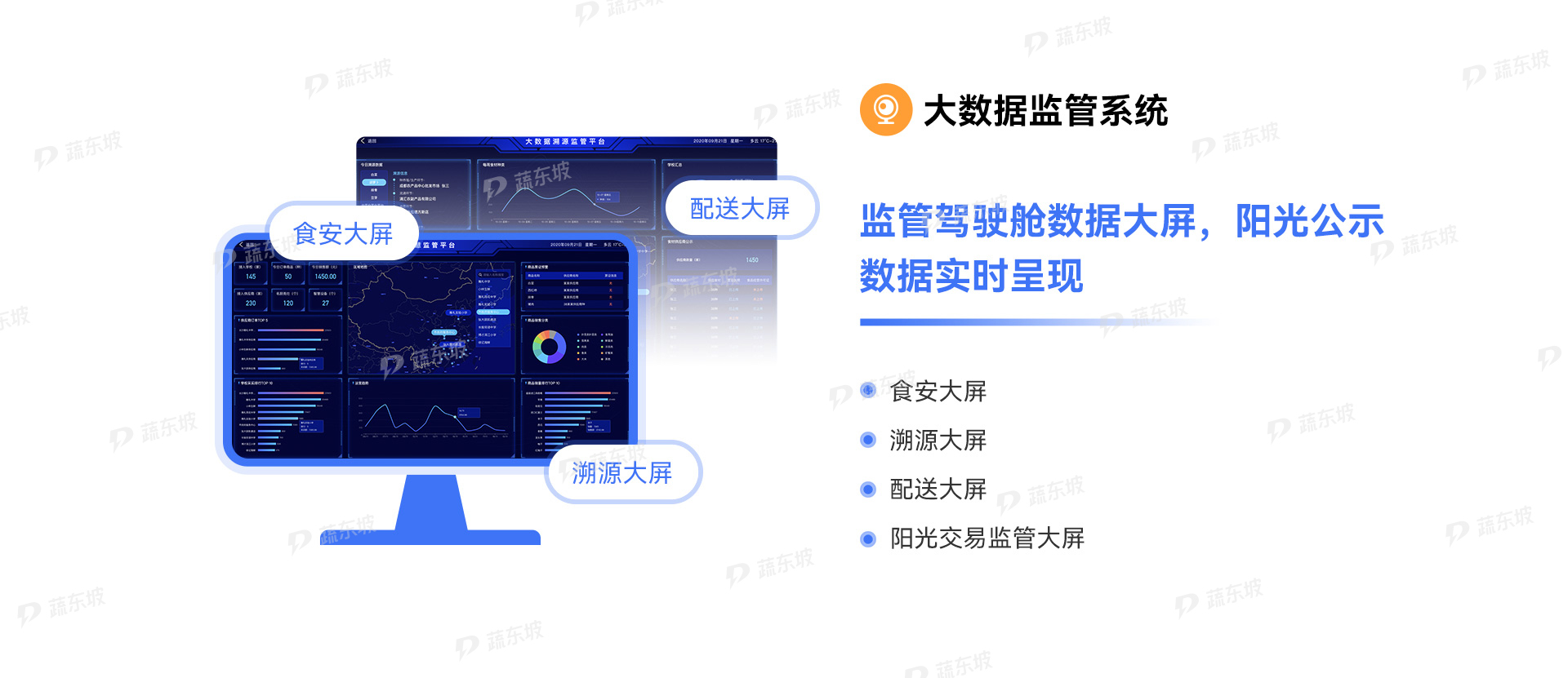 大数据监管系统是核心中枢,协助教体局、市场监督管理局等监管部门全链条监管食材采购,实现数据透明化。