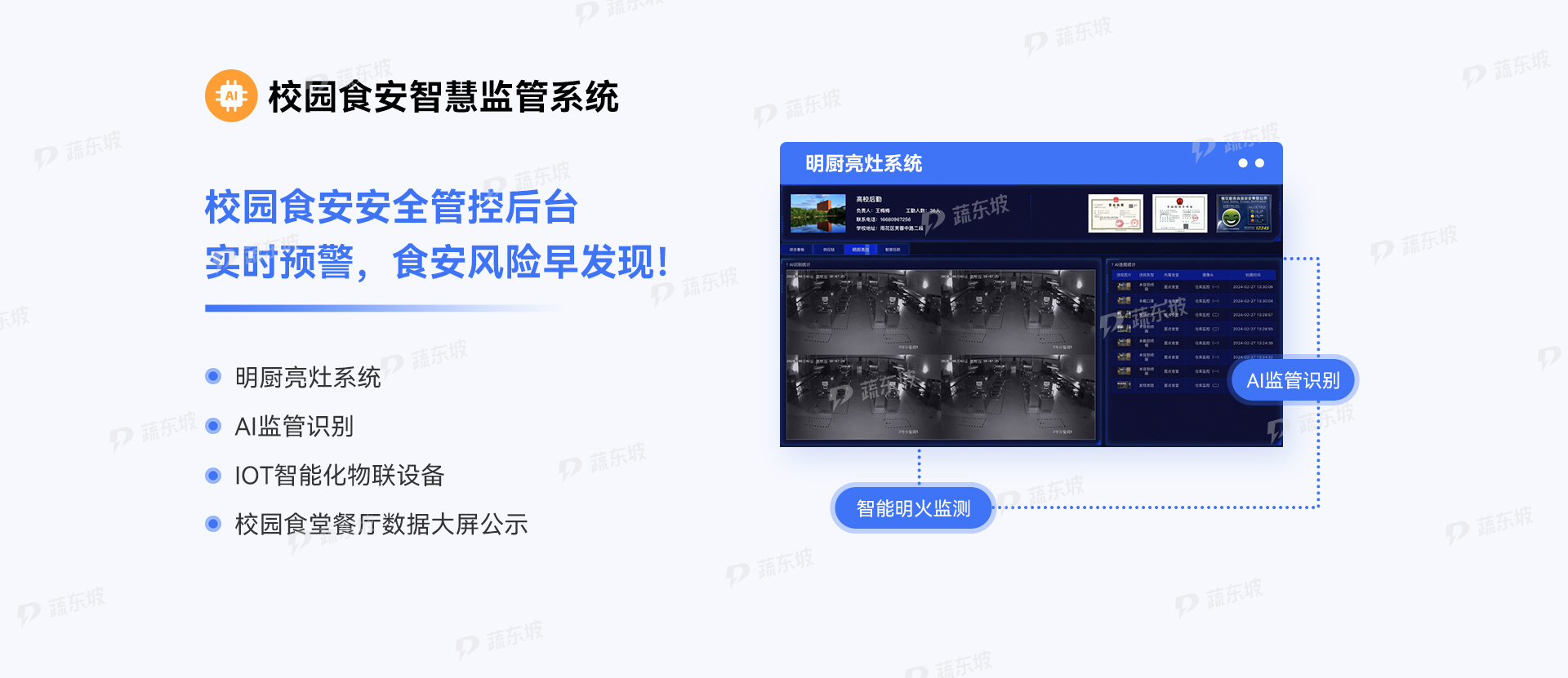 晨检巡检设备可实时监测食堂工作人员健康状况;AI识别监管设备自动识别食材质量问题;配送车载GPS让监管部门实时监控食材运输过程。