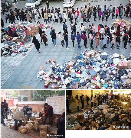 学校有大量临时放置点,在特殊时间段应该事先讲好,学校应该有一个统一的地方。随意堆放的快递在校园也是大煞风景。学校应该给他找地方,有这个思想,问题迎刃而解。
