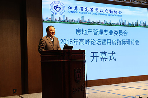 1月4日,江苏省高等学校后勤协会房地产管理专业委员会2018年高峰论坛暨用房指标研讨会在南京大学国际会议中心顺利召开。本次论坛由江苏省高等学校后勤协会房地产管理专业委员会主办,江苏省共创软件有限责任公司承办。江苏省高等学校后勤协会副会长、房地产管理专业委员会主任、中国矿业大学副校长赵建岭,江苏省高等学校后勤协会副会长兼秘书长黄在宇,南京大学校长助理孙冶东,教育部高等学校中小学校建设标准编制专家组组长奚道章教授,江苏省高等学校后勤协会房地产管理专业委员会秘书长、中国矿业大学总务部党委书记刘建光出席会议。江苏省高等学校后勤协会房地产管理专业委员会副主任、副秘书长单位及省内80余所会员单位高校和业内专家共190余名代表参加了会议。