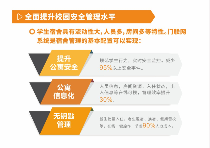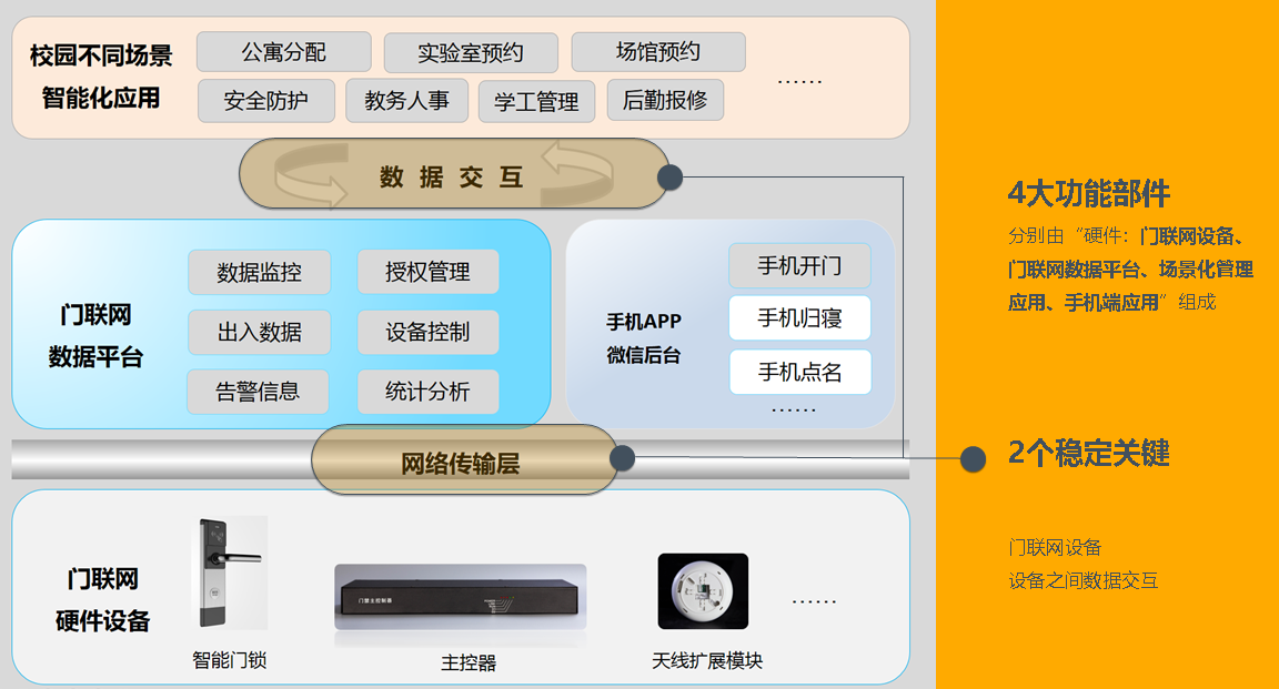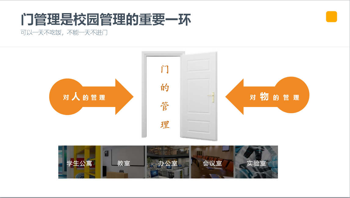 “可以一天不吃饭,不能一天不进门”,门就是对人和物的管理,学校的办公室、实验室、会议室、教室、宿舍等都涉及到人员的进出,而在每天必用的这些场合仍然沿用传统的钥匙进行管理,成为了校园信息化建设的“最后一公里”掌门物联门联网方案就是为了解决这个人和物的管理保障。