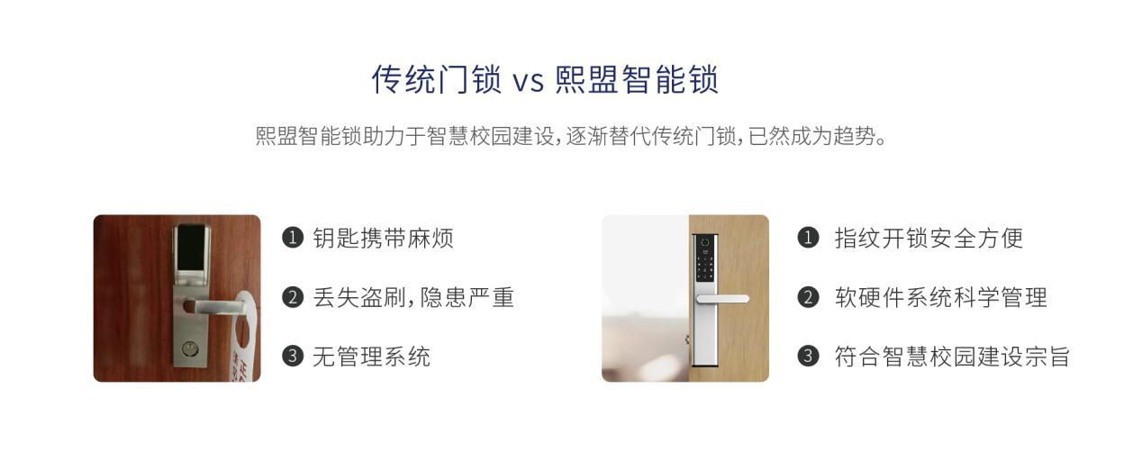 钥匙管理繁琐,在入住退宿,以及日常调换宿环节,钥匙分发、回收环节工作繁多复杂,极易出现管理漏洞。既不方便宿管部门管理,也不方便学生入住退宿。熙盟智能门锁通过生物信息采集,锁定学生信息并与宿舍绑定,从此告别钥匙管理烦恼。