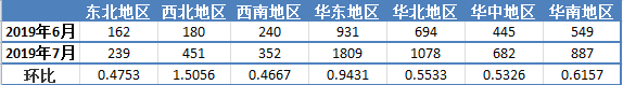 从7月中标信息地区统计图和全国中标信息地区占比图来看:华东地区中标信息量为1935条,占比37%;华中地区中标信息量为982条,占比19%;华北地区中标信息量为826条,占比16%;华南地区中标信息量为685条,占比13%;西南地区招中标信息量为415条,占比8%;东北地区中标信息量为199条,占比4%;西北地区中标信息量为185条,占比3%。