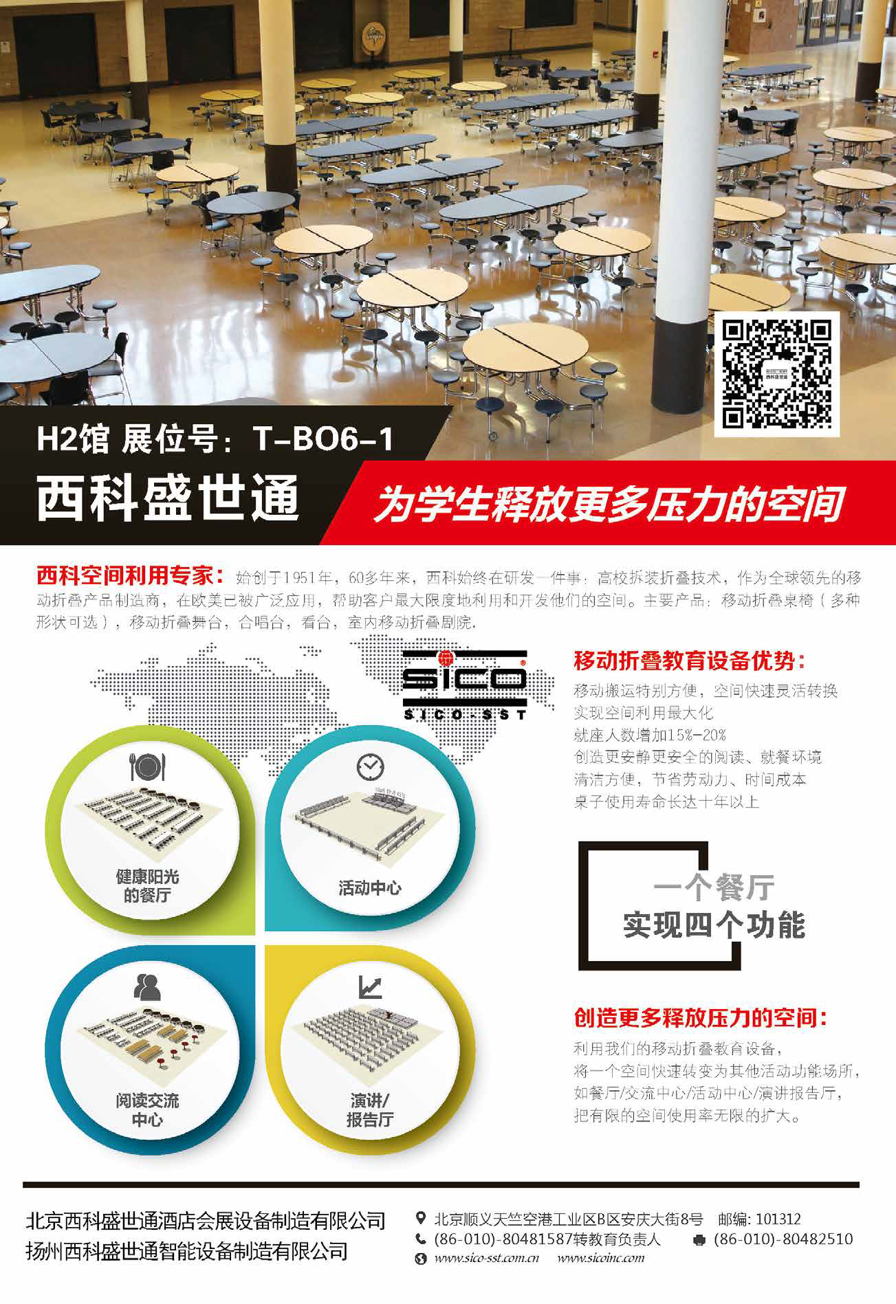 西科公司始创于1951 年,在全球拥有十余家分工厂和分公司,60 多年来,西科始终在研发一件事:高效拆装折叠技术,作为全球领先的移动折叠产品制造商,在国内和欧美被广泛应用,帮助学校最大限度地利用和开发空间。西科盛世通主要产品:移动折叠带凳桌椅(多种形状可选),移动折叠舞台和合唱台,看台,室内移动折叠剧院等。