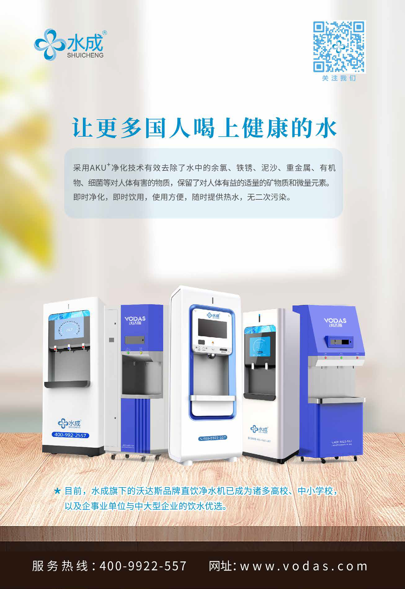 水成致力于解决工厂、企业、学校、医院、办公楼等公共场所及家庭生活健康饮用水问题,推出了一系列公用终端直饮水机和家庭净水器,旗下“沃达斯”牌商用直饮净水机已在诸多知名高校、中小学校、企事业单位等公用场所安装使用,并受到了广泛好评。